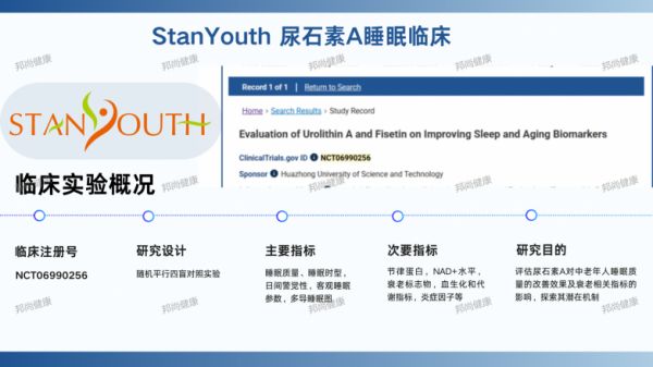目前,邦尚健康正在进行一项高质量随机对照临床试验,旨在验证品牌原料StanYouth尿石素A通过调控多项衰老相关指标来改善睡眠质量和整体健康的效果。该研究将为“尿石素A + S-雌马酚”这一双通路联用策略,提供坚实的人体临床证据与科学应用前瞻。