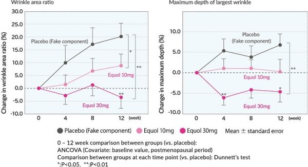 图5:SEquol对皮肤老化皱纹面积和深度指标的影响说明:人体研究中,连续服用雌马酚可有效改善皮肤皱纹,且效果呈剂量依赖性。