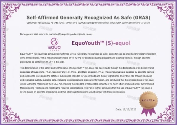 正是这种普遍的“肠道代谢差异”,让直接补充S-雌马酚成为一种更可靠的选择——它绕过了个体菌群转化效率的不确定性,直接为身体提供具有明确临床实证的活性形态。在此方向上,邦尚健康旗下EquoYouth™ S-雌马酚作为高品质原料的代表,以其通过美国SA-GRAS安全认证为品质背书,更积极布局并开展人体临床实验,进一步夯实其科学可信度。正以“安全有认证、功效有研究”的完整证据体系,为市场提供稳定、可靠、即用的抗衰解决方案。