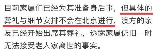 她的女儿等亲属已经证实,老人的后事在澳洲办理,国内不再有其他活动,但是,叶落归根,骨灰估计还要带回来。