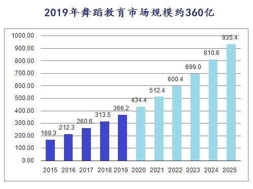 与此同时,舞蹈教育市场的客单价也呈稳定增长态势,兴趣类舞蹈学生客单价可达2400元/年,再以5.83%的舞蹈通识教育渗透率估算,2019年我国舞蹈教育市场规模约为360亿元。