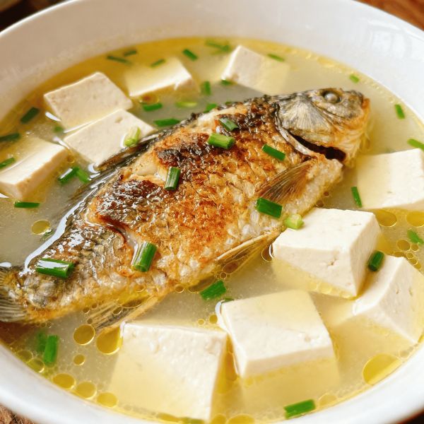 鲫鱼处理干净,划几刀,用盐、料酒腌制 15 分钟;豆腐切小块,姜切片,葱切葱花;锅中加油,放鲫鱼煎至两面金黄,加姜片和热水(热水汤更白),大火煮开转小火炖 25 分钟;放豆腐炖 10 分钟,加盐、白胡椒粉调味,撒葱花。