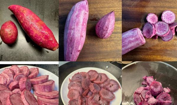 1.将紫薯清洗干净,去皮,切成薄片。然后放入锅中,用冷水开火蒸15分钟,待熟透后捞出,倒入大盆中准备和面。可以趁热加入糯米粉,用筷子顺时针方向搅拌成棉絮状,再用手揉成团。面团醒面10分钟后再揉,会变得更加光滑。