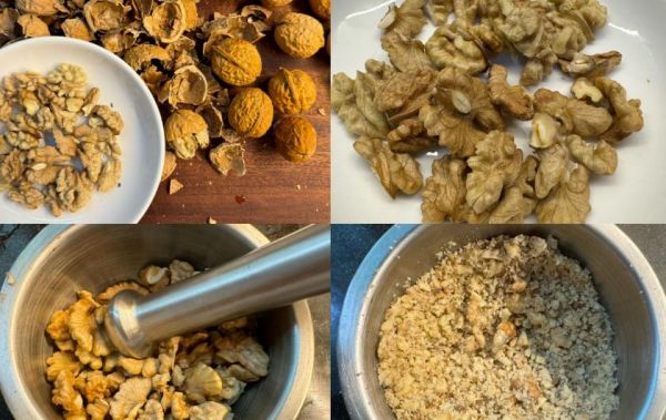 3、取出新鲜的核桃仁,放入臼子中,用力压碎备用。