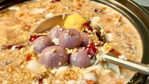 紫薯丸子汤的主要食材包括糯米粉、紫薯、醪糟、核桃、鸡蛋、红糖、红枣和枸杞。这些食材搭配起来,能够营养丰富,味道香甜。