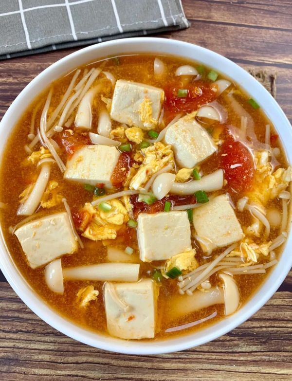 做法简述:番茄炒软后加水煮沸,加入豆腐块,调味后撒上葱花即可。全程不超过15分钟。