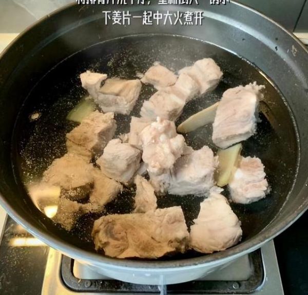 2.薏米焯水:将炖汤锅中放入洗净的排骨,加入姜片、葱结,倒入适量冷水,加入几勺料酒焯水。这样可以去除排骨的血腥味道。