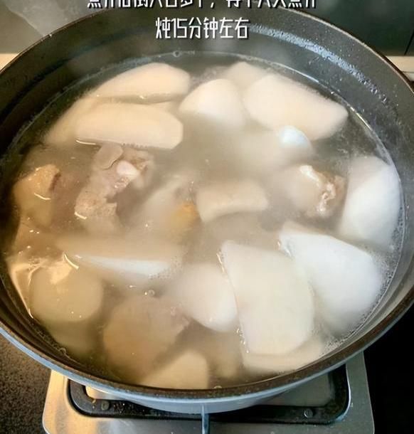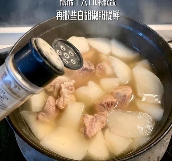 4.小火焖煮:用小火炖煮约1.5个小时,让食材慢慢焖煮至软烂状。最后放入白萝卜块,加入适量的食盐和胡椒粉,使汤汁入味。