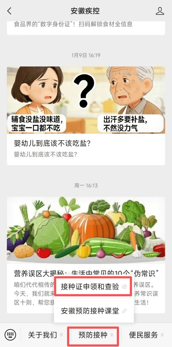 打开“安徽疾控”微信公众号,点击底部“预防接种”菜单,选择“接种证申领和查验”。