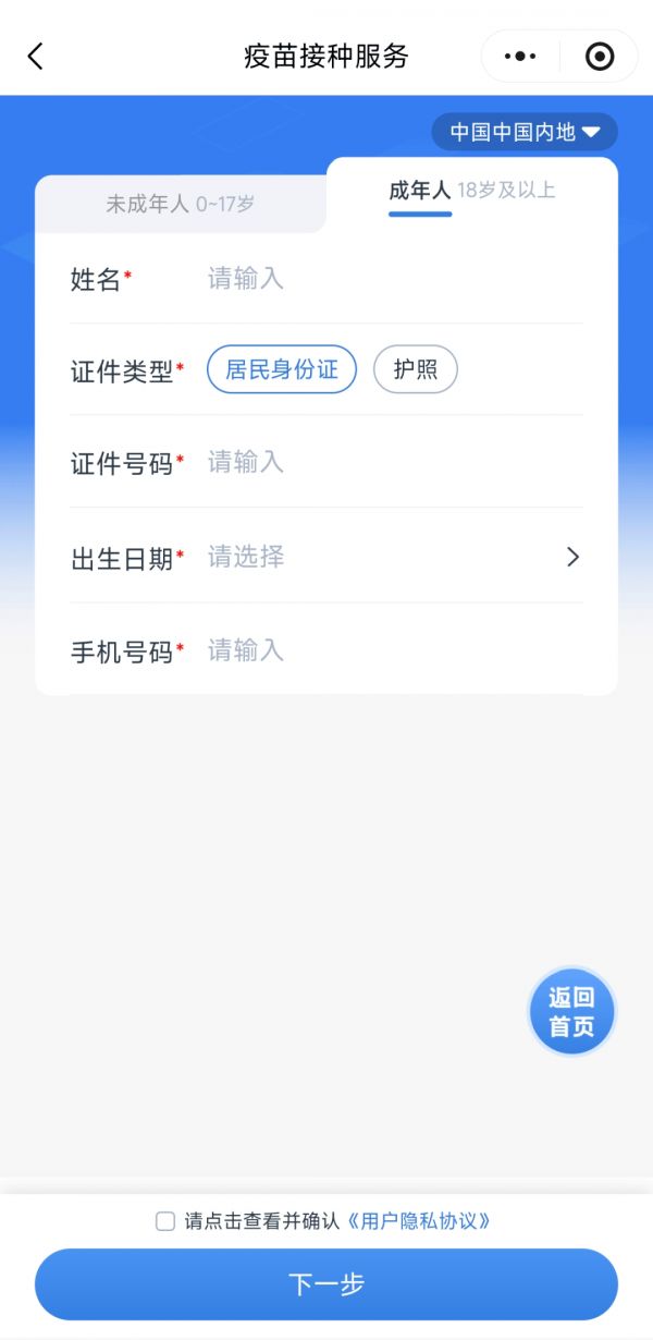 进入服务页面,如果用户是第一次使用疫苗接种服务,需要点击顶部“申领电子预防接种证”,根据申领人年龄选择页面,并填写相关信息。