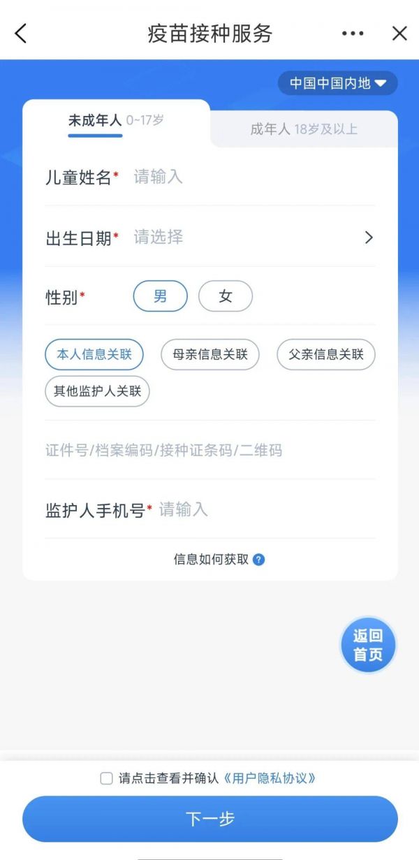 申领人信息填写完毕后,点击页面底部“下一步”,页面提示“填写的信息已有接种档案,系统已自动关联。”说明申领人信息已绑定成功。