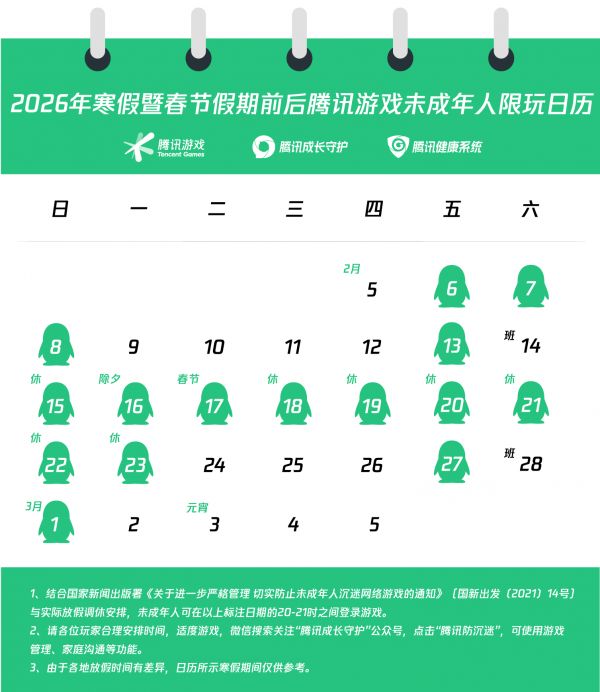 腾讯游戏推出2024寒假暨春节未成年人游戏限玩日历