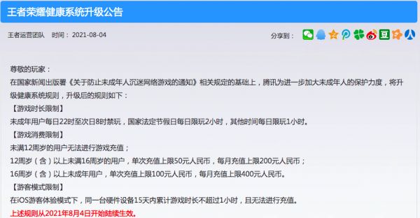 公告从时长和消费等层面对未成年人玩家进行了限制。时长上,未成年用户每日22时至次日8时禁玩,国家法定节假日每日限玩2小时,其他时间每日限玩1小时;消费方面,未满12周岁的用户无法进行游戏充值。另在王者荣耀的iOS游客体验模式下,同一台硬件设备15天内累计游戏时长不超过1小时,且无法进行充值。