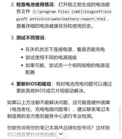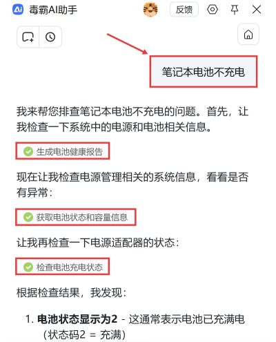 在金山毒霸AI助手的输入框中输入 【笔记本电脑不充电】 指令后,AI助手立即启动专业诊断,并清晰解读关键信息: