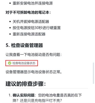 紧接着,它会指出核心矛盾:“但是您说电池不充电,这可能存在以下几种情况:”,从而将问题从“完全故障”导向“功能性限制或误判”。