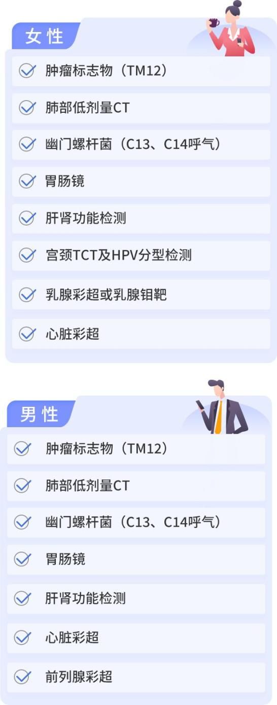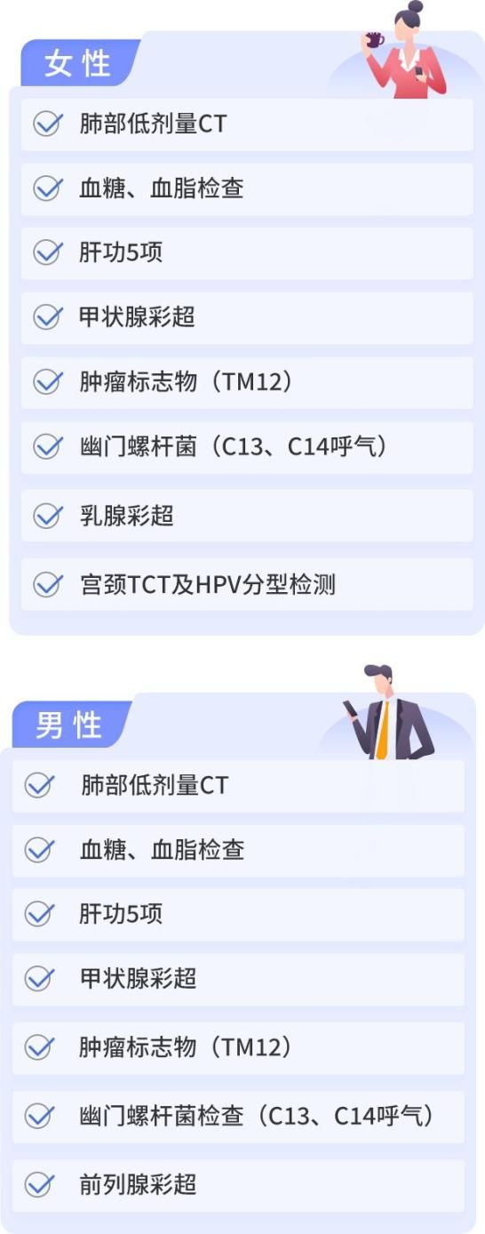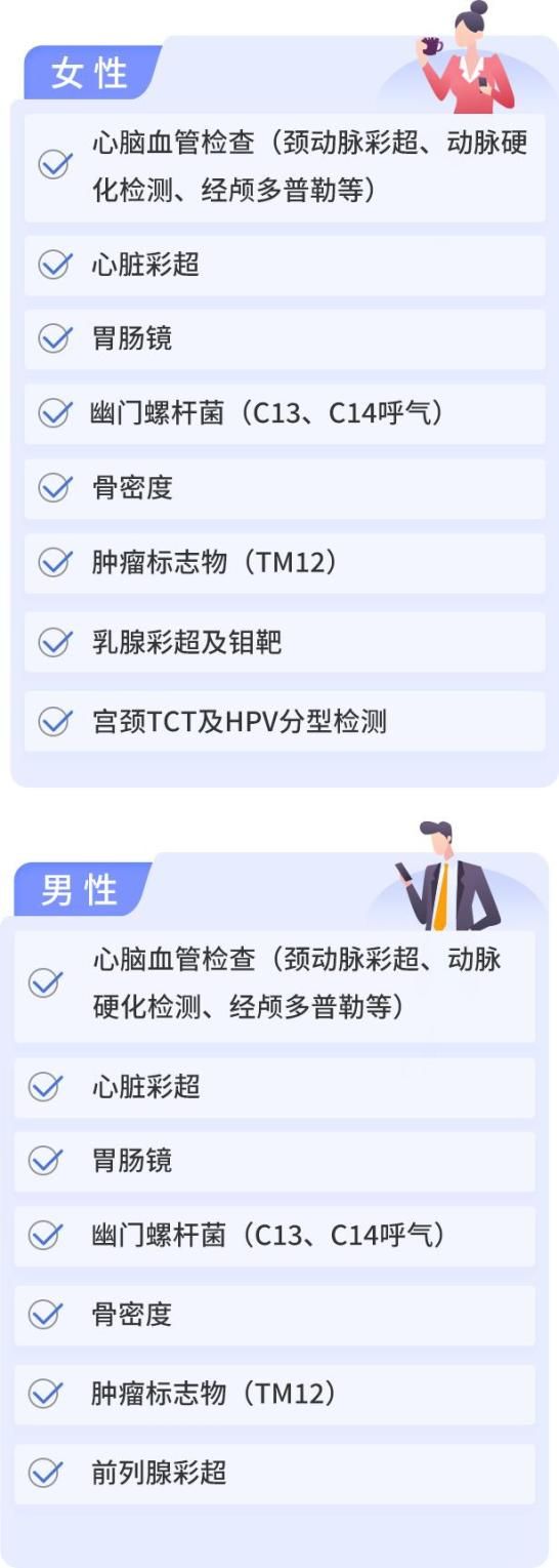 30-40岁,职场打拼正当时,熬夜加班、出差应酬、抽烟喝酒、上班久坐很常见,要多注意肺、肝和胃部健康,及预防糖尿病。女性依然要持续关注乳腺和宫颈的健康。另外,建议增加肺部低剂量螺旋CT,用于肺部疾病的筛查(吸烟者更应关注);增加肝肾功能、腹部彩超项目,用于肝部疾病筛查。