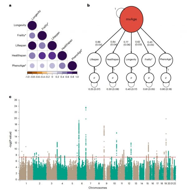 人类衰老是一个受多种因素影响的多方面过程。一些个体可能会遭受慢性健康问题和疾病并早逝,而其他人可能在相对健康的状态下达到老年。了解这种变异的基础因素对于制定公共卫生干预和改善健康衰老的治疗方法非常重要。全基因组关联研究(GWAS)已经开始使用单一表型方法,包括极端长寿、健康寿命和亲代寿命,来识别与衰老相关的位点。然而,这些单一方法未能考虑到这些特征或其他与衰老相关的特征之间共享的遗传学如表观遗传学年龄加速(EAA)和虚弱,这些因素可以进一步揭示人类衰老的广泛遗传结构,并为研究生存向纳入年龄相关结果的互补措施的转变提供信息,以改善健康衰老,即在老年阶段维持幸福、满意和充实感。在这里,作者将基因组结构方程模型应用于构建多变量衰老相关的GWAS(在此称为“mvAge”),以识别广泛影响健康衰老过程的新遗传变异。