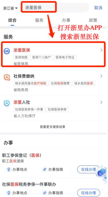 1.打开“浙里办”APP,在搜索栏输入“浙里医保”并进入专区。