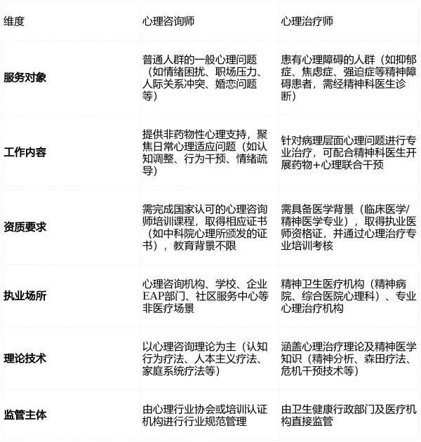 心理咨询师与心理治疗师是我国心理健康服务体系中的两个关键角色,二者均致力于帮助个体改善心理状态,但在服务对象、执业资质、工作范畴等方面存在本质差异,以下为核心对比: