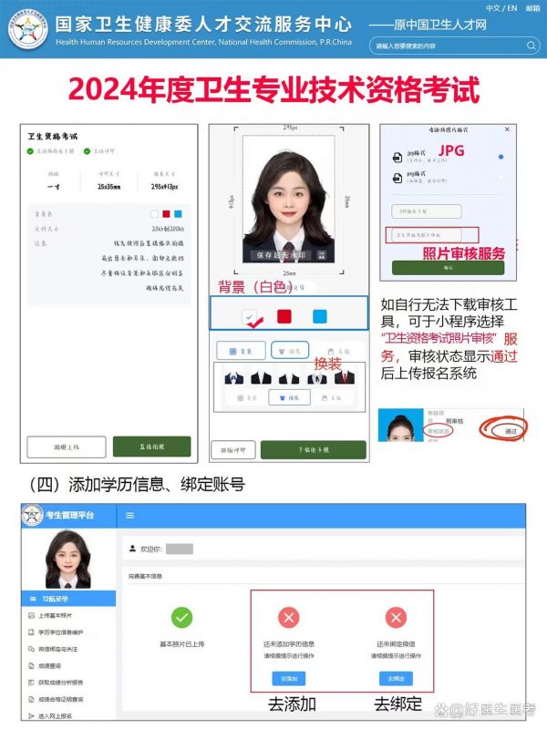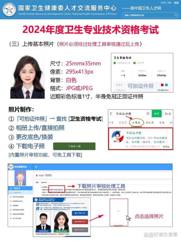 1、登录国家卫生健康委人才交流服务中心网 ,点击“参加考试”。2、点击“网上报名”3、点击注册。4、如实准确填写信息,仔细核对。5、上传照片:近期彩色标准一寸照,背景为白色,格式为jpg/jpeg。报名照片可以使用可拍证件照的卫生资格考试规格制作,里面也提供照片审核服务可以免工具下载,审核通过的照片直接上传报名系统。6、学历信息维护。7、关注“中国卫生人才网”。