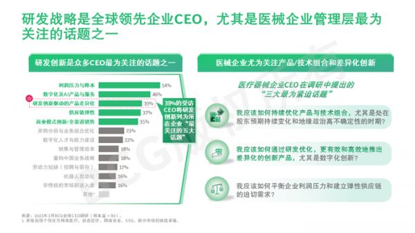 BCG对全球众多领先企业CEO的调研显示,研发创新战略已成为企业高管高度关注的话题之一。其中,医疗器械企业尤为关注如何打造有竞争力的产品与技术组合,以及如何高效地推出差异化的创新产品。