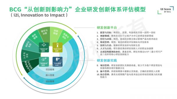 企业也需要对自身的研发创新能力开展全面诊断。BCG基于长期为众多全球领先企业,尤其是超百家头部医疗器械企业在研发创新领域的项目经验,构建了“从创新到影响力”(i2i,Innovation to Impact)的企业评估模型及其对应的评估数据库。该模型从两大维度、十大研发创新体系核心要素出发,系统性评估企业的研发创新体系成熟度,并能精准量化企业在所属细分赛道的竞争力身位。评估结果能使企业管理层与核心研发团队充分洞察公司的竞争优势,从而在制定研发战略和推进研发项目时有所侧重。基于BCG近十年的持续追踪研究,我们观察到头部医械企业(年营收规模超百亿美元)在研发创新体系的十大核心要素上呈现出较为明显的能力分化特征。通常而言,头部企业在项目管理、愿景目标、管控与绩效等要素上展现出绝对的竞争优势,特别是建立一套高效的“阶段-节点”项目管理制度已然成为领先医械企业必修的“基本内功”。然而,在产品与技术组合管理维度,即便是综合评分位居前10%的企业也依旧面临着一定挑战,尤其是在“制定清晰的组合管理策略”以及“最优化研发资源配置”方面。
