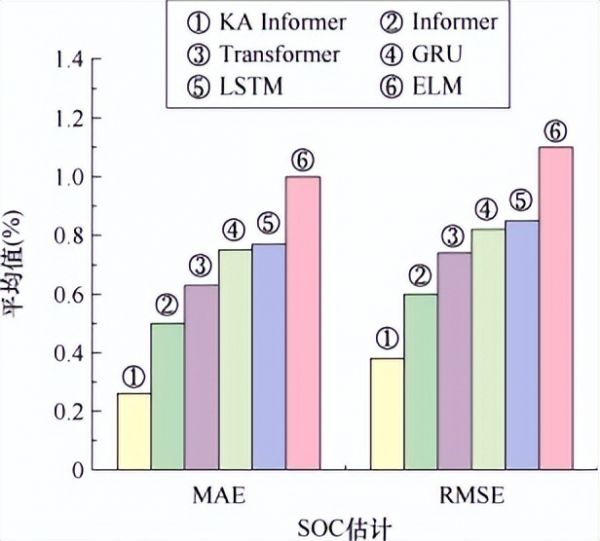 图4 各模型 SOC 估计 MAE 和 RMSE 平均值对比