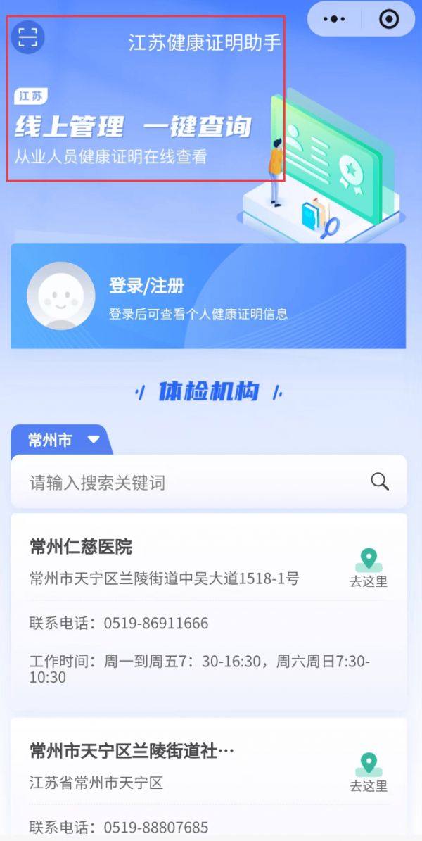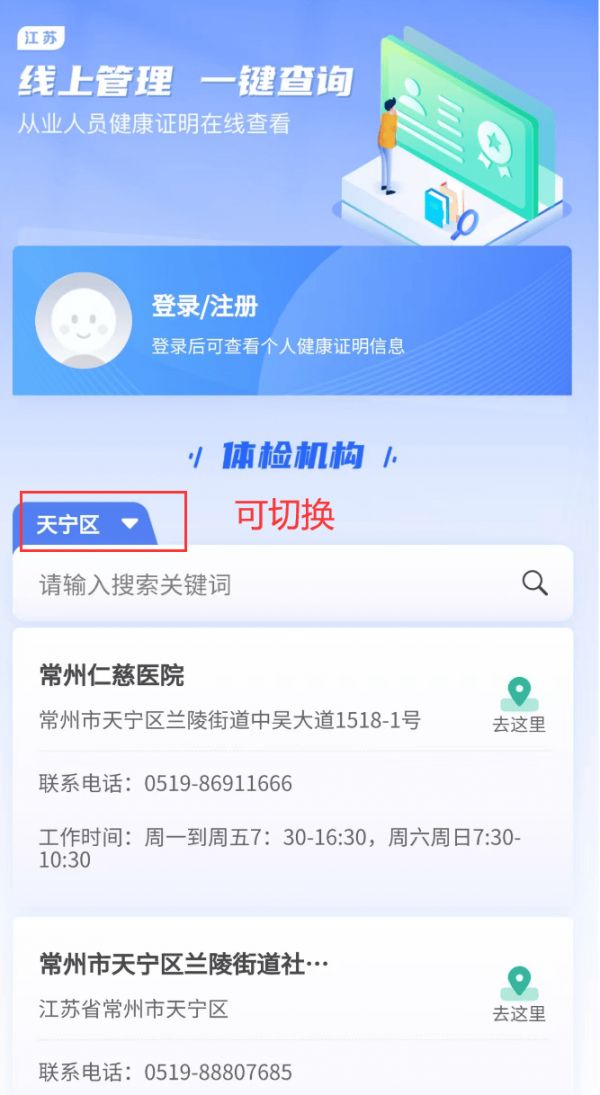 从业人员如果需要进行体检和办理健康证明,现在可以在页面查看所在城市的体检机构。