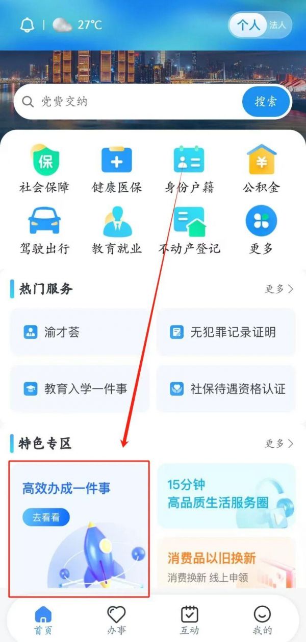 打开APP后,点击底部菜单“首页”,轮播图第一行就是“高效办成一件事”,点进去后再选“更多”。