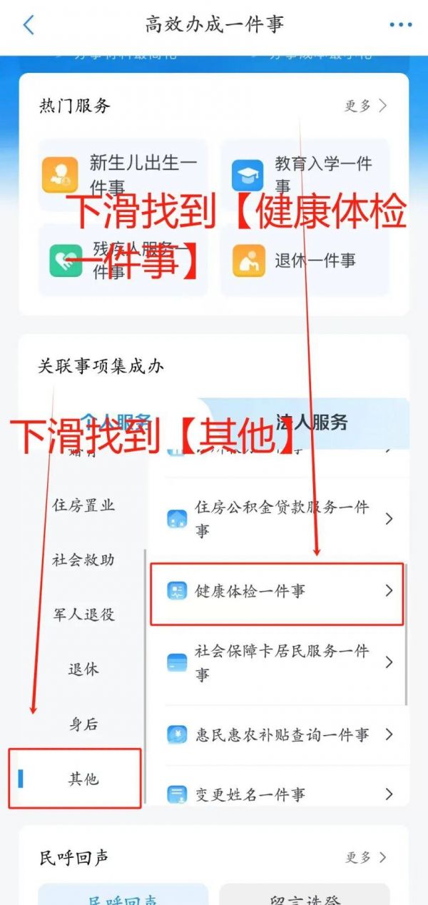 在“关联事项集成办”里勾选“个人服务”→“其他”,页面会跳转至“健康体检一件事”专区,此处支持体检预约与结果查询。