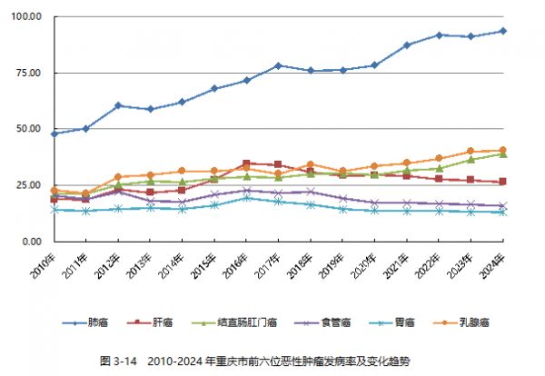 《报告》分析称,从2010年到2024年,全市前六位的恶性肿瘤报告发病率大部分呈上升趋势,少部分比较平稳,其中:肺癌发病率由48.11/10万上升至93.66/10万;乳腺癌发病率由22.89/10万上升至40.68 /10万;结直肠肛门癌发病率由21.42/10万上升至39.24/10万;肝癌发病率由18.99/10万上升至26.75/10万。