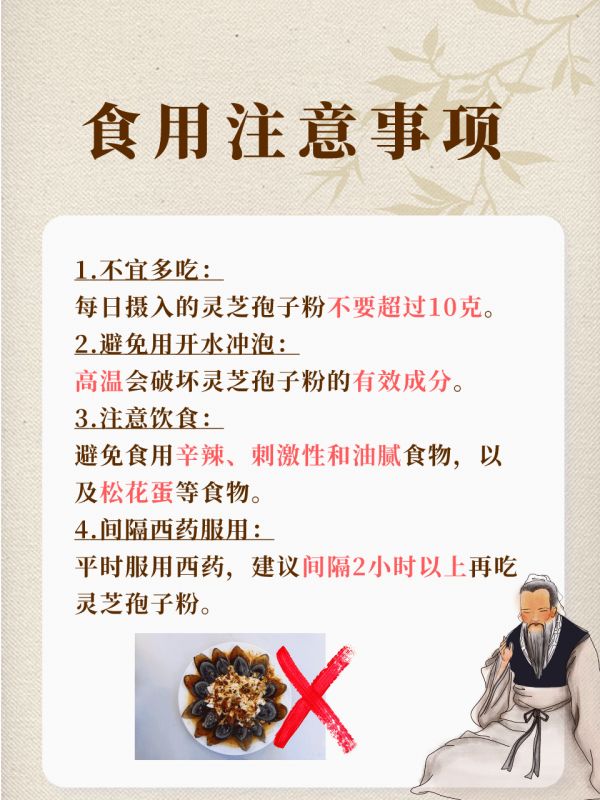 注意饮食:服用灵芝孢子粉时,避免食用辛辣、刺激性和油腻食物,以及松花蛋等食物。