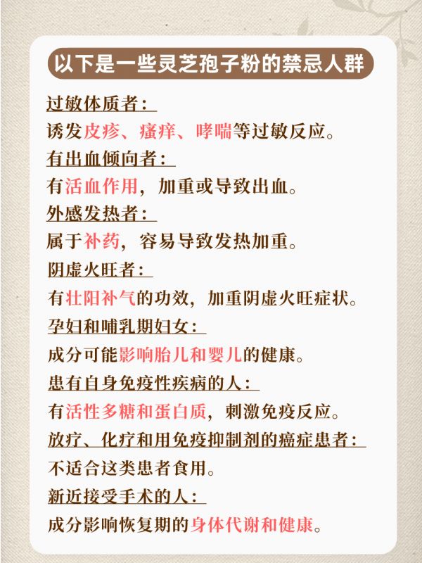 有出血倾向者:灵芝孢子粉具有活血作用,可能加重或导致出血,因此有出血倾向的人应避免食用。