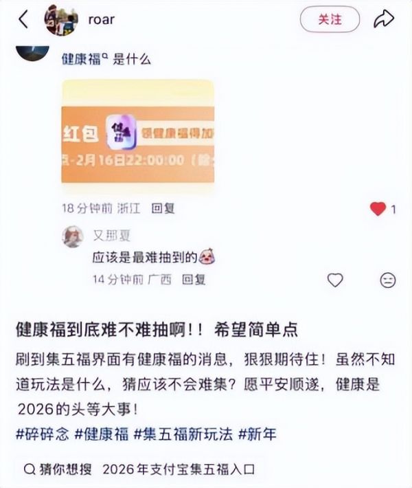 2026年2月3日消息,日前,一年一度的支付宝集五福活动准时开启,与往年不同的是,今年健康AI应用“蚂蚁阿福”额外发放一张“健康福”,而这一变化引发了全网共鸣,有网友表示“健康才是成年人最大的福”。