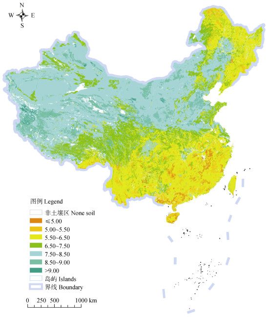 注:数据源自包括“973”项目和中国科学院战略性先导科技专项等多个研究项目、部分省级土系志以及2010年以后相关论文等。该图基于国家测绘地理信息局标准地图服务网站下载的审图号为GS(2019)1822号的标准地图制作,底图无修改。 Note: Data are from several projects including the national "973" project and the Strategic Priority Research Program of the Chinese Academy of Sciences, Soil Series of several provinces of China, and related papers published after 2010. The map is made based on the standard map No. GS(2019)1822 downloaded from the standard map service website of the National Administration of Surveying, Mapping and Geoinformation of China, without modification of the base map. 图 2 中国土壤酸碱度图 Fig. 2 Soil pH map of China