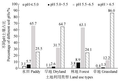 利用第二次全国土壤普查后至2015年前后较新的土壤pH数据,本文初步绘制了中国土壤酸碱度图(图 2)。整体上,我国酸性土壤明显分为南方红黄壤地区和东北地区。具体数据分析表明,我国pH < 6.5的酸性土壤总面积约311.1万km2,约占陆域国土面积的32.4%,其中,60.3%分布在南方红黄壤地区,23.3%分布在东北地区,其他地区占16.4%(表 1)。我国pH < 5.5的酸性土壤总面积约44.8万km2,约占陆域国土面积的4.7%,其中,75.0%分布在南方红黄壤地区,17.0%分布在东北地区,其他地区占8.0%。pH≤5.0、pH 5.0~5.5、pH 5.5~6.5的酸性土壤面积分别占酸性土壤总面积的4.3%、10.1%、85.6%。与第二次全国土壤普查相比,我国酸性土壤总面积增加64.5万km2,其中pH≤5.0、pH 5.0~5.5、pH 5.5~6.5范围面积分别增加3.1万、11.6万、49.9万km2,表明各个pH范围的酸性土壤面积均在增加,以pH 5.5~6.5范围增加最多;南方红黄壤地区、东北地区、其他地区分别增加19.6万、23.0万、22.0万km2,表明我国土壤酸化较为普遍。不同土地利用类型土壤pH分析结果表明,水田和林地酸性土壤占比较高、非酸性土壤占比低,而旱地和草地相反(图 3),这可能因为水田主要分布于我国南方红黄壤地区,而旱地和草地主要分布于我国北部和西部地区,林地的土壤酸化是酸沉降和枯枝落叶腐解等多种因素的作用结果。