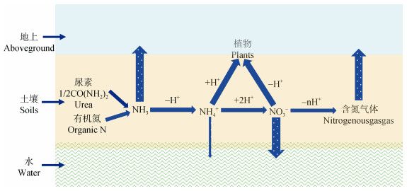 干湿沉降氮和肥料氮均会诱导土壤酸化,氮被认为是全球土壤酸化的重要诱因[20]。时间演变和现有不同地块土壤数据表明,氮肥是农田土壤酸化的重要诱因[6]。从20世纪80年代至21世纪初,我国农田土壤pH平均下降了0.5个单位,对于小麦、玉米、水稻等主要作物,70%的农田土壤酸化是过量施氮造成,对于果蔬田土壤,过量施氮对酸化的贡献率甚至高达90%[19]。不可否认,氮与土壤酸化关系密切。大气氮和硫干湿沉降是自然植被下土壤酸化的主要诱因,其机制较清楚,此处不再详述酸沉降氮导致土壤酸化的机制。尿素是氮肥的主要种类,国内有学者认为尿素是碱性肥料,基于酸碱平衡原理,认为尿素施入土壤不会导致土壤酸化,因而质疑氮肥导致土壤酸化的观点。以下从土壤氮素转化过程中H+的产消平衡,讨论氮肥与土壤酸化的关系。