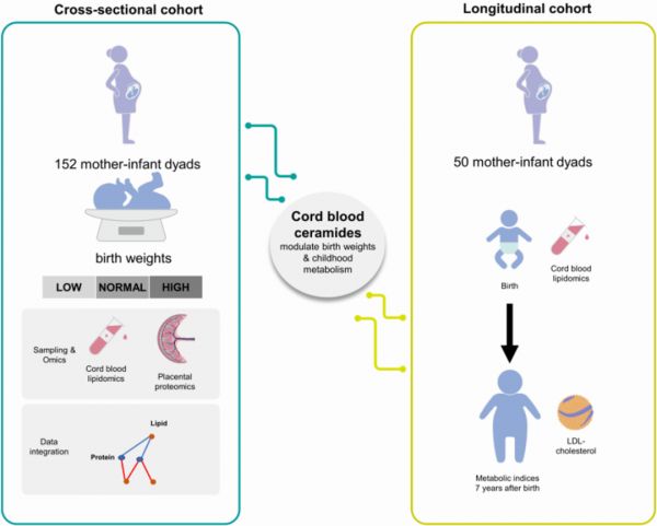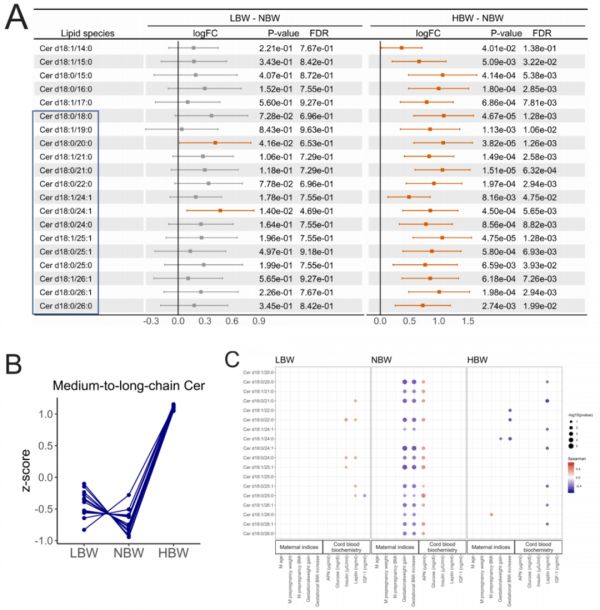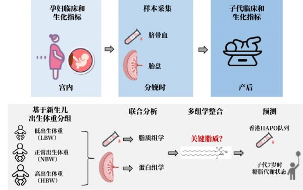 研究团队前期收集了56例低出生体重儿(LBW,出生体重<3000 g)、27例高出生体重儿(HBW,出生体重≥4000 g),以及69例与之匹配的正常出生体重儿(NBW,出生体重≥3000~<4000 g)的脐带血。对脐带血进行高覆盖的靶向脂质组学和胎盘蛋白组学研究,以研究与出生体重相关的脐带血脂质的分子功能。进一步联合香港高血糖与妊娠不良结局(HAPO)前瞻性队列,探讨脐带血脂质分子对7岁儿童代谢健康预测价值。