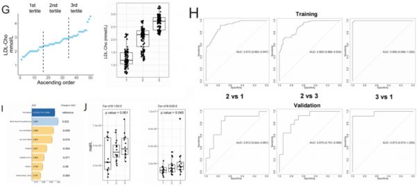 最后,研究人员联合HAPO研究的50对母子进行了前瞻性队列研究,以探究基线时测量的脐带血脂质是否可以预测儿童7岁时的代谢状况。相关分析表明,几种Cer与第7年测定的总胆固醇(TC)、高密度脂蛋白胆固醇(HDL-C)和低密度脂蛋白胆固醇(LDL-C)呈正相关。研究人员根据第7年的LDL-C水平将子代分成三组,ROC曲线分析中三组间呈现出令人满意的AUC值,训练集AUC>0.9、验证集AUC>0.8。临床队列结果证明了基线脐带血Cer水平可预测儿童期血清LDL-C水平。