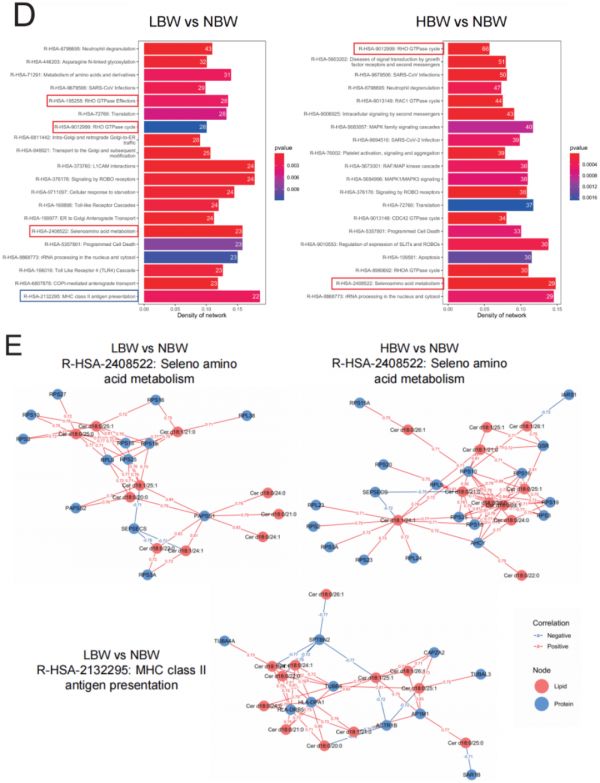 为了系统地探索脐带血Cer在调节出生体重中的功能,研究人员使用成对的胎盘蛋白质组和脐带血Cer数据进行了跨组学整合。结果显示,与NBW相比,“硒氨基酸代谢”为组间最重要的代谢途径(LBW和HBW)。脂蛋白相关网络显示,VLC-Cer(C22-C25)与硒代半胱氨酸合成酶(SEPSECS)蛋白水平呈负相关,而与核糖体小亚基和核糖体大亚基蛋白质(RPS、RPL)的许多成分呈正相关。“RHO GTPase循环”和“RHO GTPase效应器”通路与LBW组和HBW组脐带血Cer水平的变化显著相关。此外,在LBW组中,“MHC II类抗原呈递”与脐带血Cer升高显著相关,脐带血Cer高水平可能会损害MHC II类抗原的呈递。人类白细胞抗原(HLA)复合物亚基蛋白水平的升高,可能代表了LBW组应对非红细胞血影蛋白β2(SPTBN2)水平降低和抗原呈递减弱的代偿机制。
