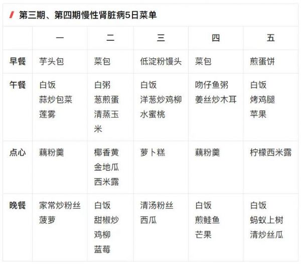 进入第三期中度肾衰竭以后,我们需严格控管蛋白质、钠、磷、钾的摄取量,才能够减缓肾机能恶化的速度。营养师示范5日「第三期、第四期慢性肾脏病饮食菜单」,列表如下: