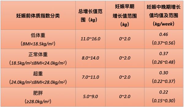 首先,我们通过孕前BMI来评估一下自己孕期增重是否适宜:表1 妊娠期体重增长参考值