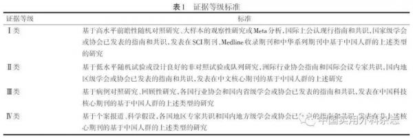 本指南证据等级参考 GRADE系统,结合中国临床研究特点制定,将证据等级分为Ⅰ、Ⅱ、Ⅲ、Ⅳ4类,量化体现指南编写专家对证据可靠性的评价情况。基于本指南在中国临床实践的可及性,专家组优先选择Ⅰ类和Ⅱ类证据纳入指南评价体系(表1)。