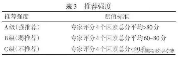 本指南推荐强度结合GRADE系统及国内临床实践特点,纳入证据等级、卫生经济学、产品等效性、可及性4个影响因素,根据权重,采用赋分制,由指南编写专家对推荐意见逐一进行评分,根据评分结果将推荐强度分为:A级(强推荐)、B级(弱推荐)、C级(不推荐)。见表2、表3。