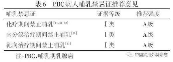 2 PBC临床实践指南推荐意见除哺乳以外,PBC病人可以参照非妊娠期乳腺癌诊治原则。哺乳禁忌证见表6。