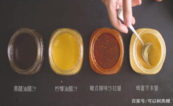哈喽,大家好,欢迎来到小马哥说美食,我是小马哥,很开心又跟大家见面了。已经到夏天了嘛,一定要减肥了,所以今天小马哥给大家带来的是4款网红沙拉酱,4款沙拉酱都是油醋汁,通过剧烈摇晃产生乳化作用得到的,分别是黑醋油醋汁、柠檬油醋汁、韩式辣味沙拉酱、蜂蜜芥末酱。正在减肥或者准备减肥的人有救了,简直是减肥者的福利!下面就向大家介绍如何制作这4份沙拉酱以及如何选择好的食材制作好吃不胖的沙拉。