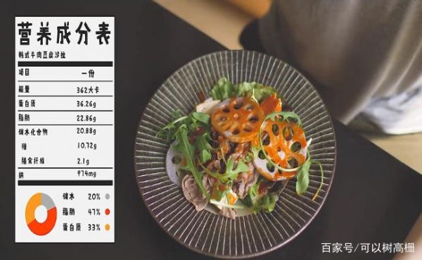 这样我们第1份沙拉做好了,能量大约362大卡,蛋白质含量36.26g,脂肪含量22.86g,这里用的食材都很天然,所以都很健康。