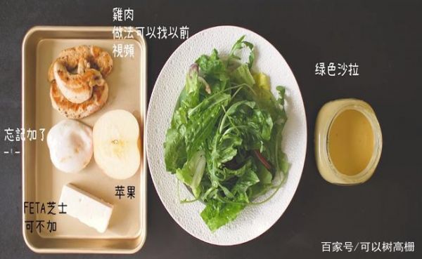 第3个是鸡肉苹果沙拉,先做蜂蜜芥末酱,用料有:第戎芥末酱(记得是第戎)、蜂蜜一大勺、橄榄油两大勺、苹果醋1-2大勺、盐和黑胡椒。沙拉部分的食材有:鸡肉、苹果、绿色沙拉、FETA芝士。苹果切成小片即可,FETA芝士切成小块(没有的话可以用煎蛋代替),鸡肉也是一样切小块,绿叶沙拉放在盆子里面垫底,然后依次加入鸡肉、苹果、FETA芝士。然后再加入两勺蜂蜜芥末酱,也可以加入一些坚果,最后搅拌均匀即可。这份沙拉能量443大卡、蛋白质42.68g,脂肪18.78g。