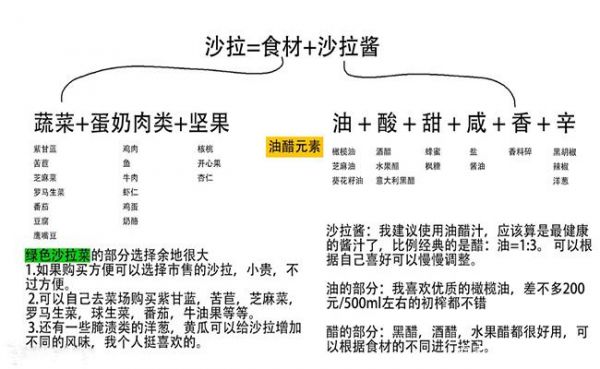 大家其实可以根据自己的喜好进行自己的搭配。沙拉酱的话,我建议用油醋汁,经典比例是醋和油是1:3,油的话我比较推荐用优质的橄榄油,差不多200块钱500毫升,醋可以用黑醋、酒醋、水果醋都不错,可以根据食材不同进行自己的搭配。肉类蛋白质可以选用鱼肉、牛肉、虾仁,比如三文鱼还有很多优质的脂肪,非肉类蛋白质是鸡蛋、奶酪、豆腐、鹰嘴豆这些。如果你喜欢吃素食的话,你可以吃非肉类蛋白质,也可以和肉类进行搭配。绿色沙拉部分选择的余地挺大的,如果你购买方便的话,你可以直接买一些市售的沙拉,有点小贵,不过很方便,你也可以去菜场购买一些单个的蔬菜,比如紫甘蓝,苦苣、芝麻菜,罗马生菜,球生菜,番茄、牛油果等等。