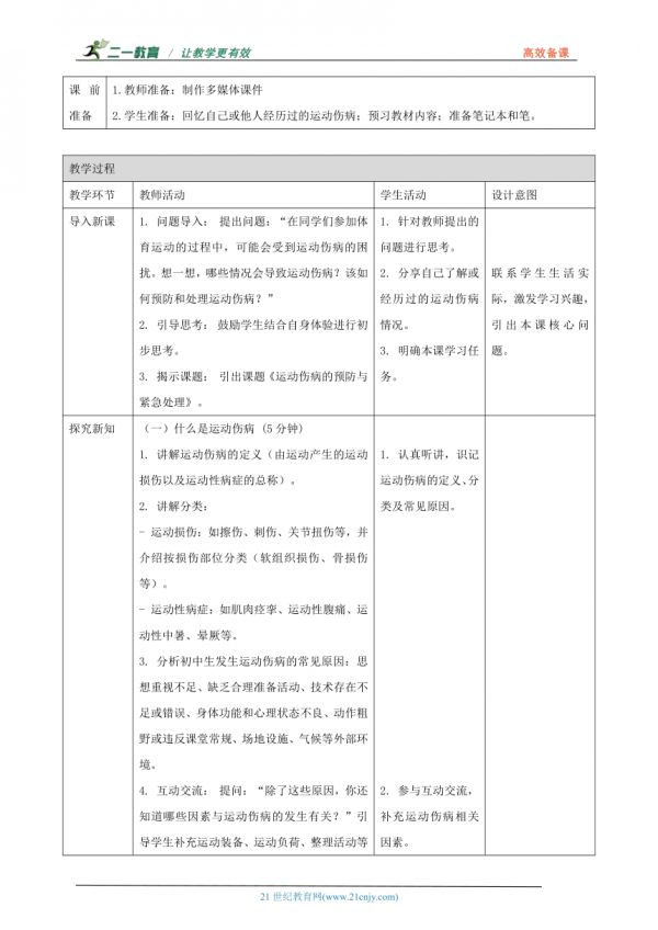 课前准备 1.教师准备:制作多媒体课件2.学生准备:回忆自己或他人经历过的运动伤病;预习教材内容;准备笔记本和笔。